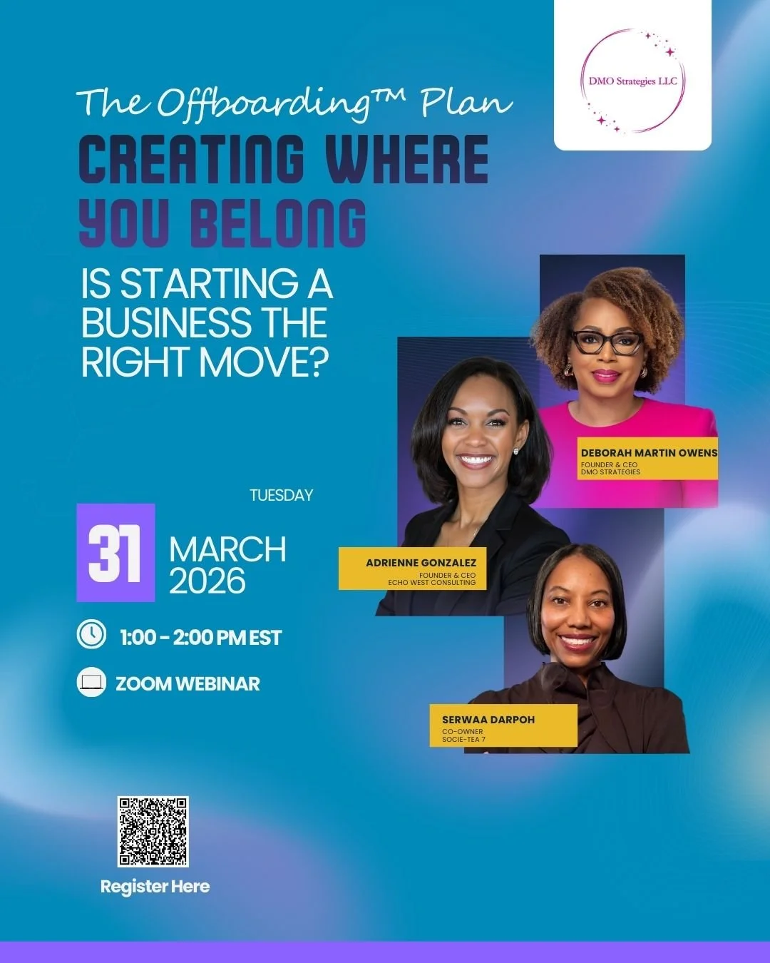 DMO Strategies LLC is dedicated to empowering individuals and organizations across the corporate and nonprofit sectors. We believe in the profound joy of bringing people and opportunities together. As "Superconnectors" and "Talent Development Whisperers," our mission is to curate experiences that facilitate meaningful connections, foster professional growth, and help attendees unlock their untapped potential. Through curated discussions and strategic networking, we aim to support your most ambitious goals.